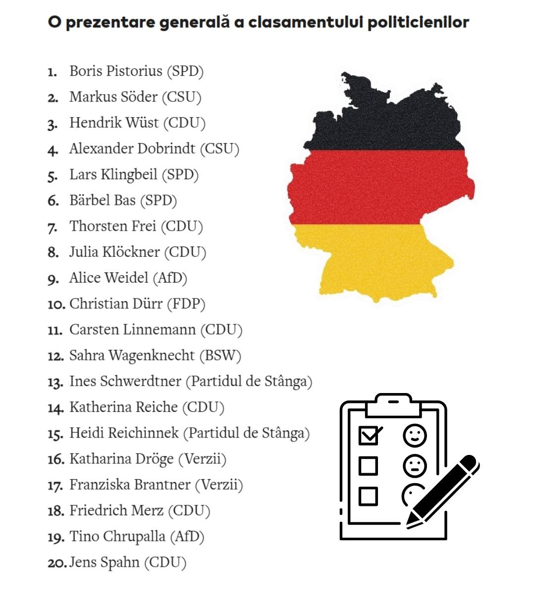 Cancelarul Friedrich Merz pierde un loc și ajunge pe 18, în timp ce copreședinta AfD, Alice Weidel, câștigă teren și intră pe poziția a noua. La vârful clasamentului nu apar schimbări, ministrul apărării Boris Pistorius rămânând cel mai apreciat politician din Germania. El este urmat de Markus Söder, Hendrik Wüst și Alexander Dobrindt, care își păstrează locurile fără fluctuații.