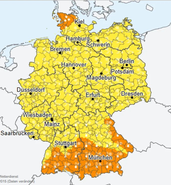 DWD a emis pentru întreaga țară o avertizare de nivel unu pentru îngheț, semnalând că acesta se va menține inclusiv pe timpul zilei, cu temperaturi ce pot coborî până la minus cinci grade Celsius. Conform estimărilor experților, în multe regiuni sunt posibile valori de până la minus zece grade, iar în zonele alpine temperaturile ar putea scădea chiar sub minus 16 grade Celsius.