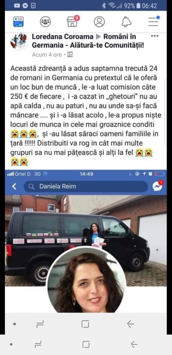 Daniela Reim, cunoscută pentru munca sa la Centru de Consiliere pentru Muncitori Mobili, a devenit victima hărțuirii online, scrie Nordwest Zeitung. Pe rețeaua de socializare au fost distribuite, pe patru profiluri și pe mai multe grupuri la care au aderat români, diferite insulte la adresa ei.