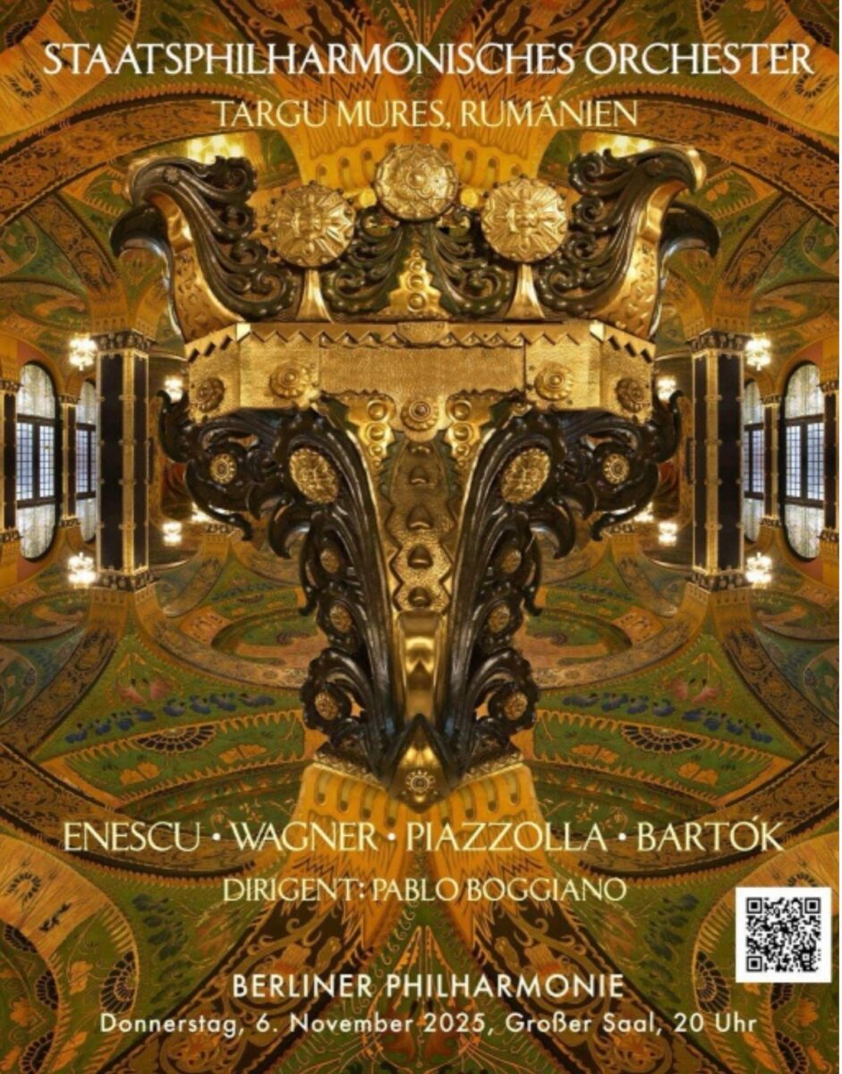Pe 6 noiembrie 2025, Orchestra Filarmonicii de Stat Târgu Mureș va susține un concert de excepție la renumita Berlin Philharmonie Hall, sub bagheta maestrului Pablo Boggiano. Evenimentul se înscrie în programul cultural dedicat aniversării a 145 de ani de relații diplomatice dintre România și Germania și promite să fie un reper în istoria ansamblului mureșean, aducând pe aceeași scenă lucrări de Enescu, Bartók, Wagner și Piazzolla.