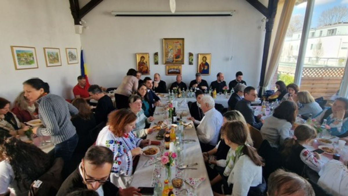 Membrii Ansamblului „Hora„, ansamblul propriu al parohiei, au venit în porturi populare pline de culoare, la fel ca și membrii Ansamblului „Zestrea” din Straubing, veniți special pentru această ocazie. Imaginea costumelor tradiționale în naveta unei biserici din inima Bavariei a spus mai mult decât orice discurs despre rezistența identității românești în Europa. La finalul Liturghiei, pr. Alexandru Nan a mulțumit ierarhului, iar întreaga comunitate s-a așezat la masă împreună — o agapă frățească organizată de doamnele comitetului parohial, sub coordonarea doamnei preotese Daniela Nan.
