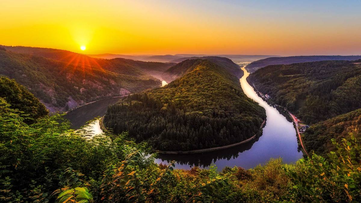 Bucla Saar (Saarschleife) de lângă Mettlach este una dintre acele priveliști greu de confundat cu altceva. Milioane de ani de drenaj al râurilor au sculptat un defileu adânc în roca dură, iar efectul este cel mai bine văzut de la punctul de belvedere Cloef. Zona este perfectă pentru plimbări și drumeții relaxante, iar o atracție suplimentară este traseul printre copaci, care face peisajul și mai spectaculos.