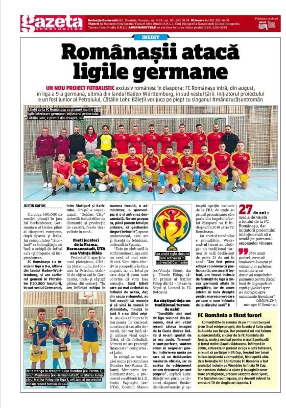 Se numește „FC Românașu” și din august 2019 va juca în liga a 9-a germană, ultima din landul Baden-Wurttemberg, cu planuri mari de a urca în clasament. Jucătorii vor afișa pe tricouri sloganul #mândrucăsuntromân.