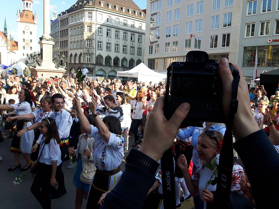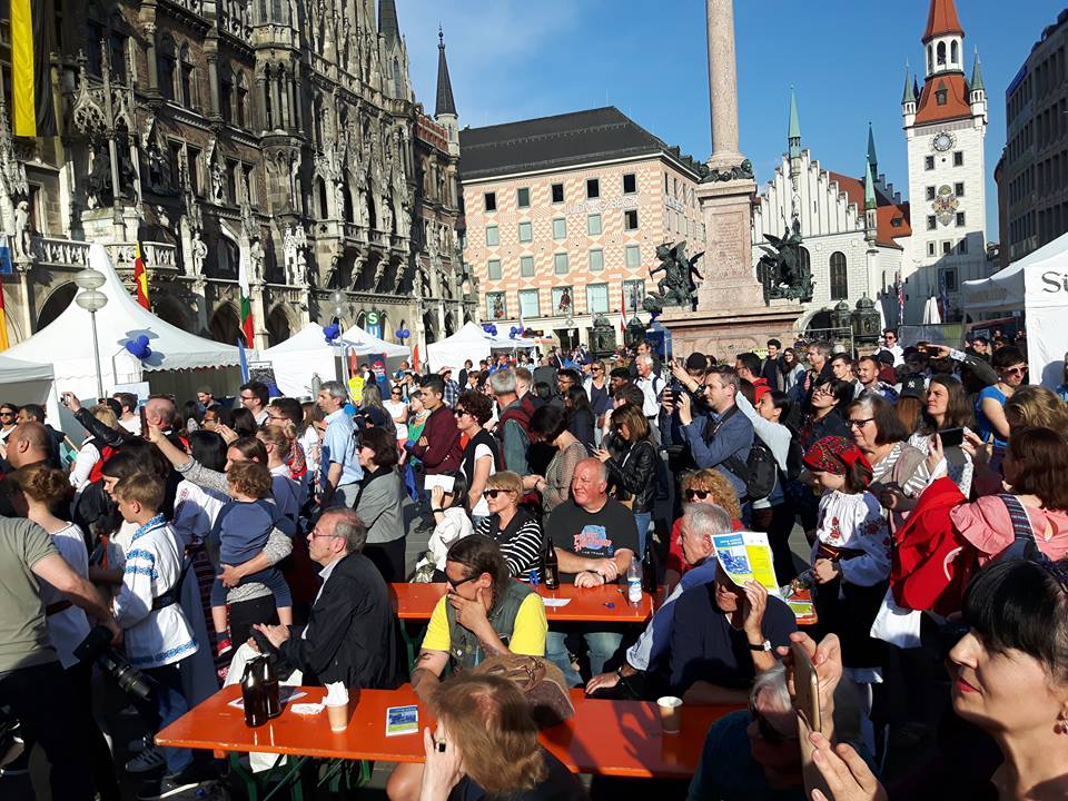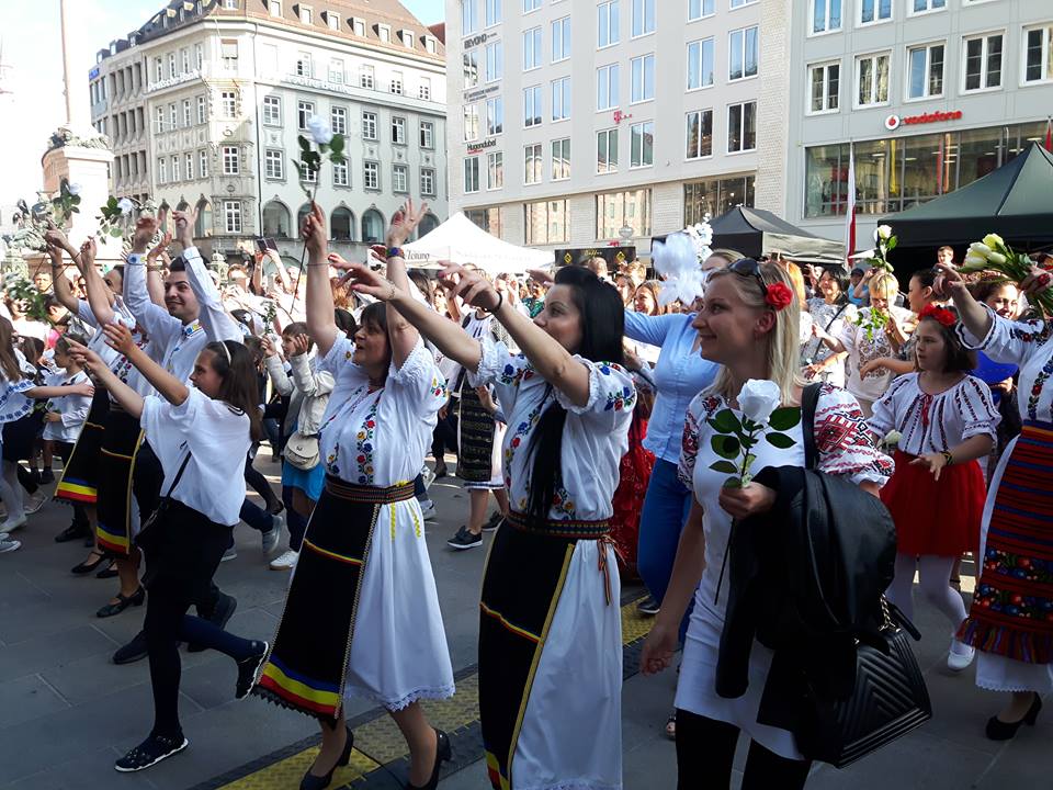 S-a cântat și dansat pe muzică românească în centrul orașului München, în Marienplatz, practic în zona zero a capitalei Bavariei, acolo unde miercuri, 9 mai, s-a sărbătorit Ziua Europei.
