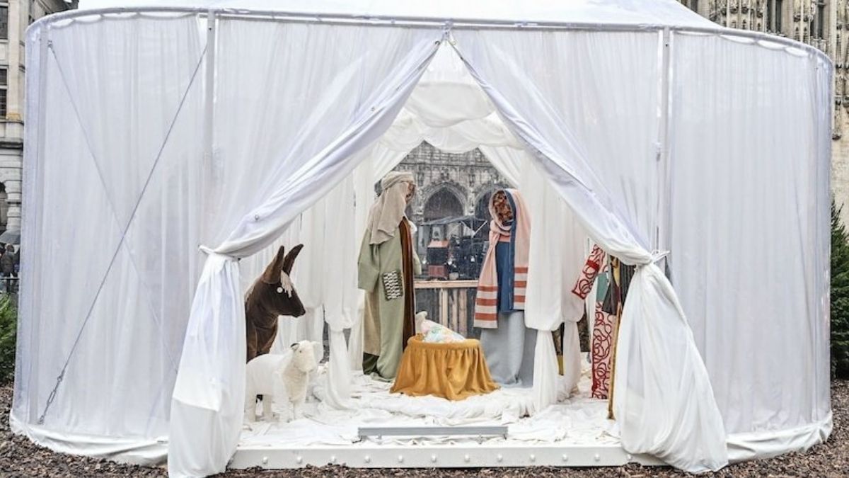 Ieslea se află în inima târgului de Crăciun din Bruxelles, un eveniment care anul trecut a atras peste 4 milioane de vizitatori, veniți să se bucure de vin fiert, ciocolată caldă și cele 238 de standuri cu jucării, haine sau decorațiuni. În centrul pieței tronează un brad uriaș, iar în apropiere a fost amplasat un cort alb care găzduiește scena nașterii Domnului, alcătuită din figurinele artistei, o catolică declarată.
