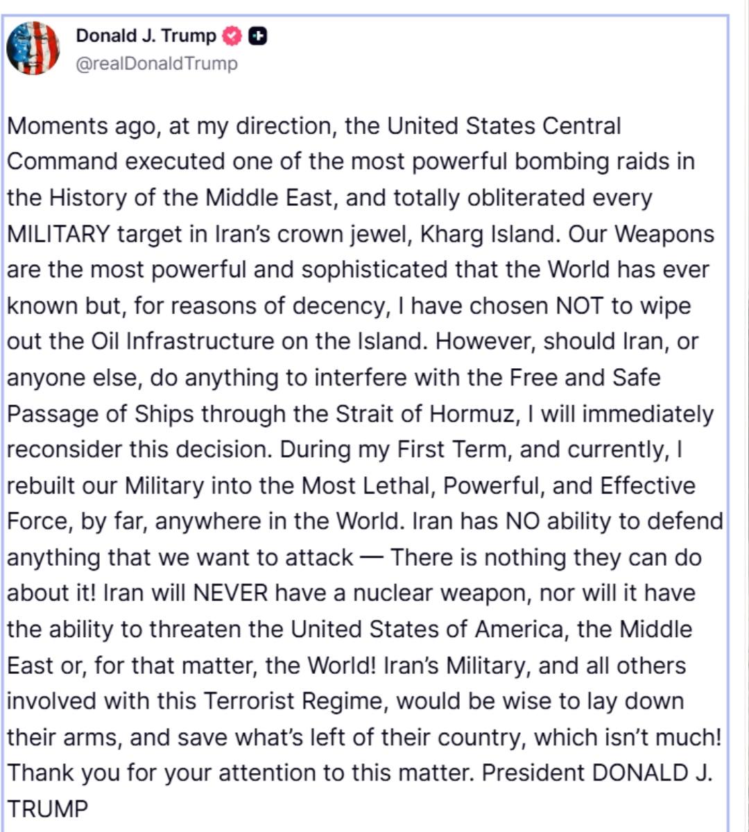 Trump anunță atacul devastator în insula Kharg – În noaptea de vineri spre sâmbătă, la ordinul direct al președintelui american Donald Trump, forțele Comandamentului Central al SUA au executat ceea ce Casa Albă a descris drept unul dintre cele mai devastatoare bombardamente din istoria Orientului Mijlociu. Ținta: Insula Kharg, o bucată de pământ de câțiva kilometri în Golful Persic, dar care reprezintă, potrivit tuturor analiștilor energetici, inima economiei iraniene.