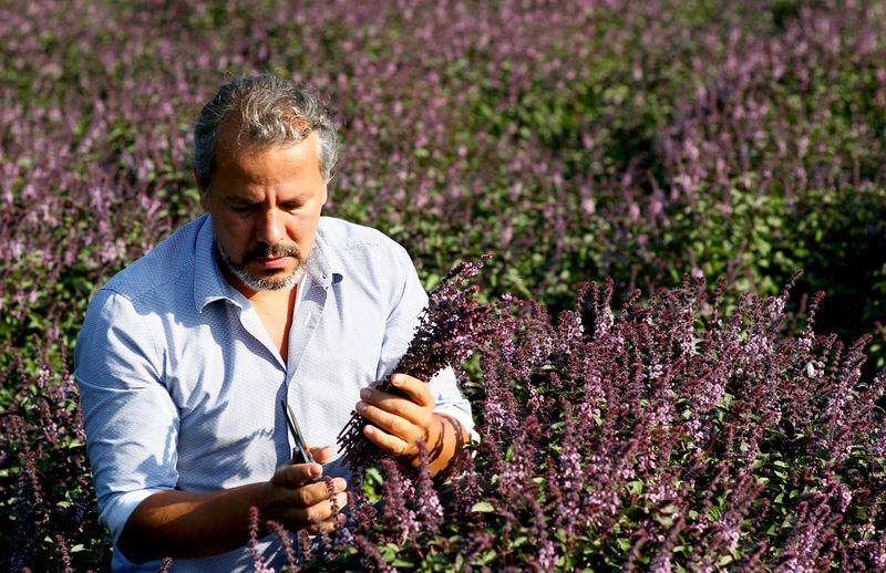 „Cei mai mulți cunosc busuiocul în una sau două variante, însă în total sunt circa 220 de soiuri diferite. Printre care și acest exotic să-i spunem soi african. A fost „dragoste la prima vedere“ când l-am văzut prima oară într-o piață din Franța. O culoare lila atât de frumoasă, cu o aromă atât de intensă“, mărturisește Paul.