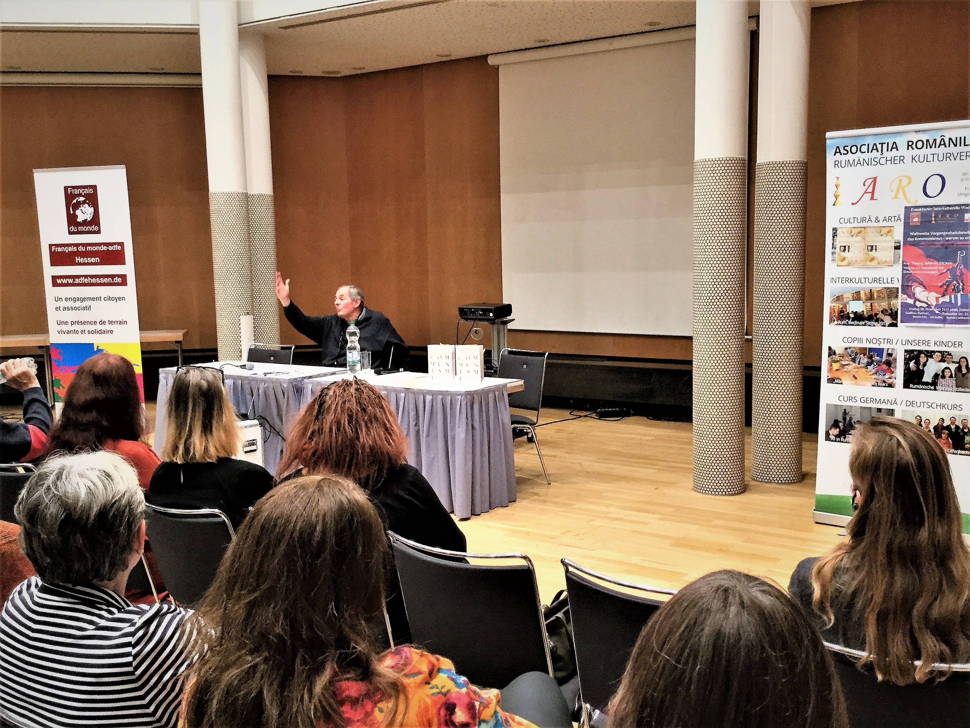 Vineri seara, 10 noiembrie 2017, în Saalbau Gutleut din Frankfurt am Main, a avut loc o conferinţă în limba franceză despre traumatismele comuniste ale secolului XX, organizată ireproşabil de ARO Asociaţia Românilor din Frankfurt / ARO Rumänischer Kulturverein Frankfurt & Umgebung e. V., www.aro-rhein-main.de. Seara a fos realizată în cadrul Săptămânii Interculturale Frankfurt, în colaborare cu ADFE-Hessen, Asociaţia Francezilor din Străinătate şi cu PJD Uniunea Jurnaliştilor Polonezi din Germania. S-a tradus simultan în germană, romană şi poloneză pentru circa jumătate din cei 75 de participanţi.
