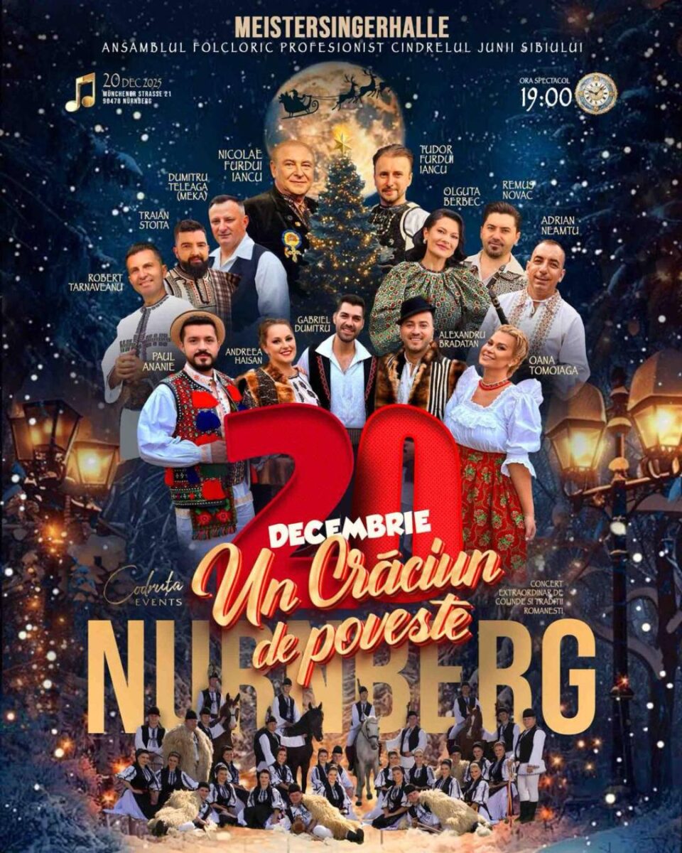 Comunitatea românească din Germania este invitată pe 20 decembrie la un eveniment unic, găzduit în eleganta Meistersingerhalle din Nürnberg, unde atmosfera sărbătorilor va prinde viață prin colinde, datini și emoția autentic românească. Concertul „Un Crăciun de poveste” promite o seară în care tradițiile se împletesc cu magia muzicii, oferind publicului sentimentul întoarcerii acasă, chiar și departe de România.