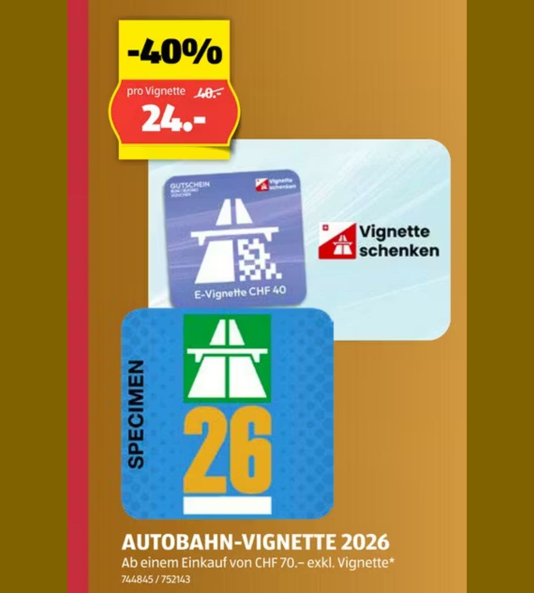 Și Aldi se alătură războiului prețurilor. Oferă vinieta – fie sub formă de autocolant, fie digital – pentru 24 de franci, cu condiția ca totalul achiziției să fie de cel puțin 70 de franci. Aceasta reprezintă o reducere de 40%.